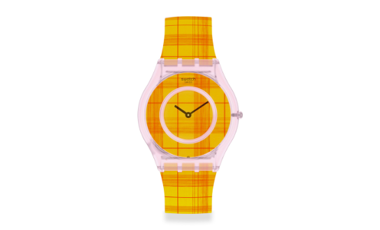 Este atrevido reloj multicolor, diseñado por supriya lele, combina un llamativo estampado inspirado en los cuadros madrás en su correa de silicona con el cristal transparente para darle un estilo distintivo.